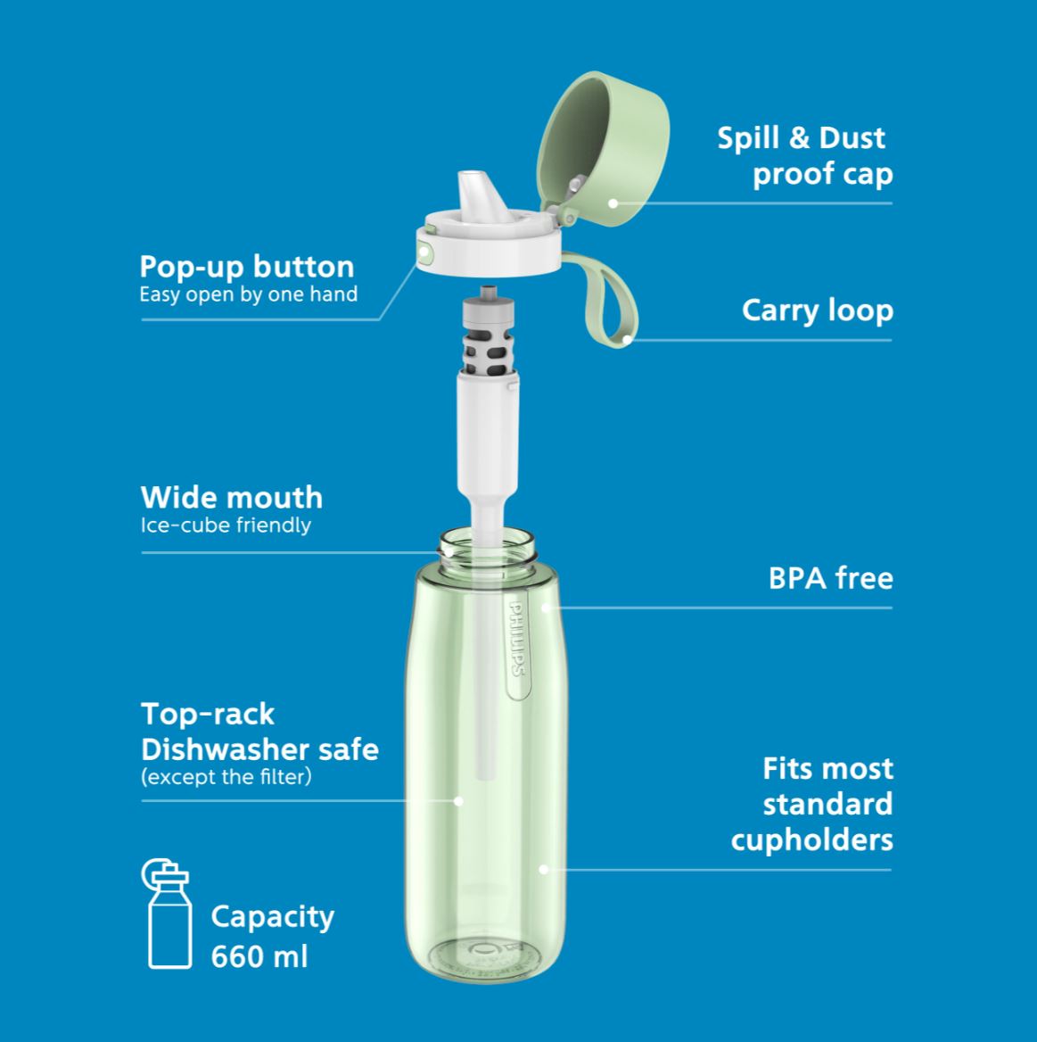 Izrađena od tritan plastike bez BPA, boca je izdržljivija, lagana, otpornija na toplinu i razbijanje.