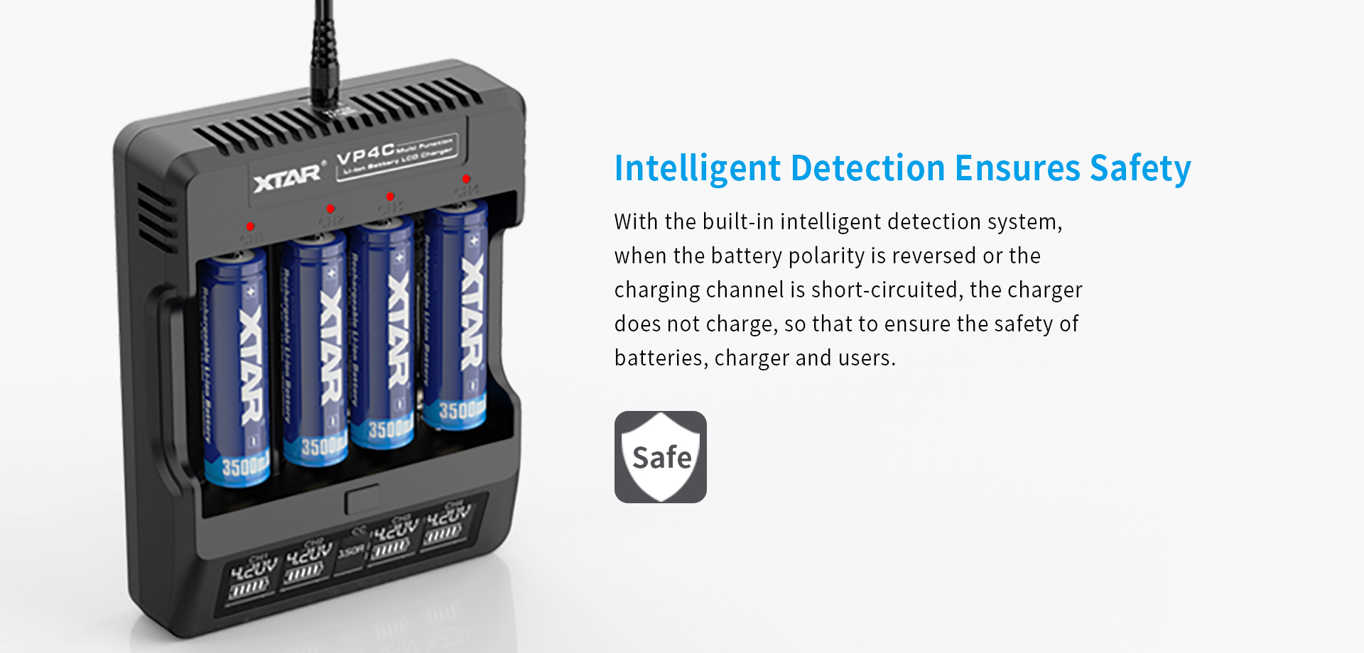 XTAR VP4C is an intelligent microprocessor controlled charger with four independently functioning charging bays.
