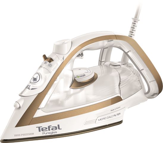 SEB Tefal parno glačalo FV8042E0. Glačalo na paru Puregliss stavlja izvanrednu njegu odjeće na dohvat ruke zahvaljujući kombinaciji snažnih performansi pare i poboljšanih funkcija. Postignite savršene rezultate za kratko vrijeme uz ovo snažno glačalo na paru od 2900 W za brzo zagrijavanje, kontinuirani izlaz pare od 50 g/min za učinkovito rezultate i dodatni udar pare od 270 g/min za tvrdokorne nabore. Naš patentirani sustav mikrokalc filtera štiti vašu odjeću od mrlja, dok niz pametnih funkcija čini glačanje lakšim iz dana u dan.